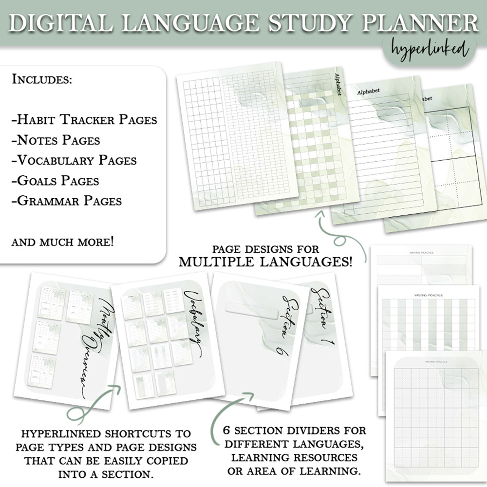 A digital language study planner with a minimalist theme. Comes with digital stickers.
